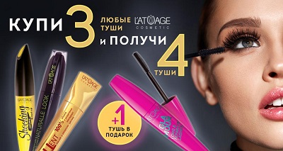 При заказе туши ТМ L'ATUAGE одного наименования в количестве 3-х штук, 4-ю тушь этого же наименования Вы получаете в ПОДАРОК!!!